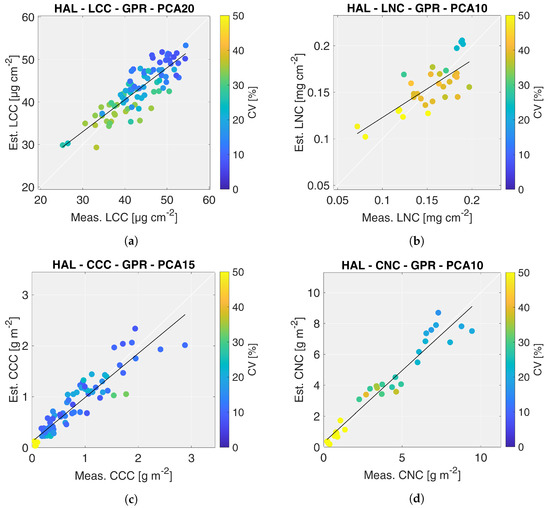 Scatter plots of the best HAL models: leaf chlorophyll content (a), leaf nitrogen content (b), canopy chlorophyll content (c), canopy nitrogen content (d). The colors of points represent the coefficient of variation (CV) estimated by the GPR algorithm.