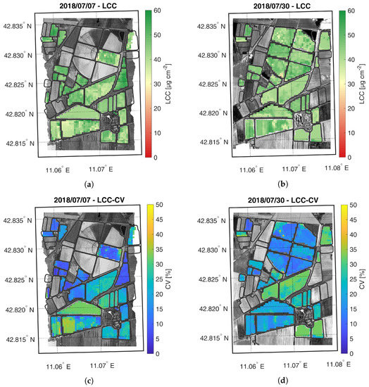 Maps of estimated LCC (a,b) and related CV (c,d) generated from synthetic CHIME-like images, simulated from the Hyplant-DUAL dataset acquired on 7 and 30 July 2018.