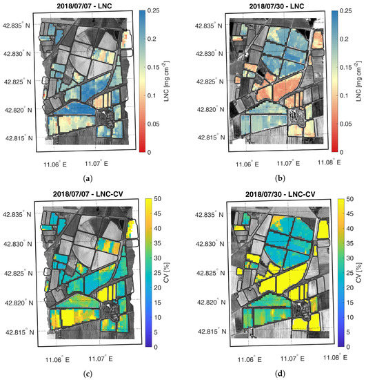 Maps of estimated LNC (a,b) and related CV (c,d) generated from synthetic CHIME-like images, simulated from the Hyplant-DUAL dataset acquired on 7 and 30 July 2018.