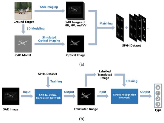 Although achieving an increasing accuracy, existing SAR ATR systems still have some problems: Firstly, preprocessing algorithms generally have no adaptive ability and can only improve image quality limitedly. Besides, most systems using the modified feature extractor or feature classifier improve the recognition accuracy by increasing algorithm complexity (the numbers of network layers or channels in deep learning methods), which increases the cost of calculation and brings the risk of overfitting to deep learning methods. There is one more point, since the acquisition of SAR images is costly and time-consuming, the vast majority of existing studies used the available part of MSTAR, while the scenarios in the practical target recognition are changing all the time [10]. The recognition of targets other than military vehicles, such as aircraft and ships, is rarely discussed, caused by a lack of data suitable for training. On the basis of these problems, our research mainly innovates in the stage of pre-processing. SAR images are translated into their optical expression through a SAR-to-optical translation network, which significantly reduces the difficulty of recognition. Feature extraction and classification are achieved through a CNN network and a fully connected network, respectively. In addition, SPH4, a new multi-view SAR dataset of aircraft targets, is created as an attempt to expand the application of SAR ATR technology.