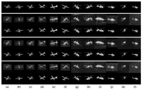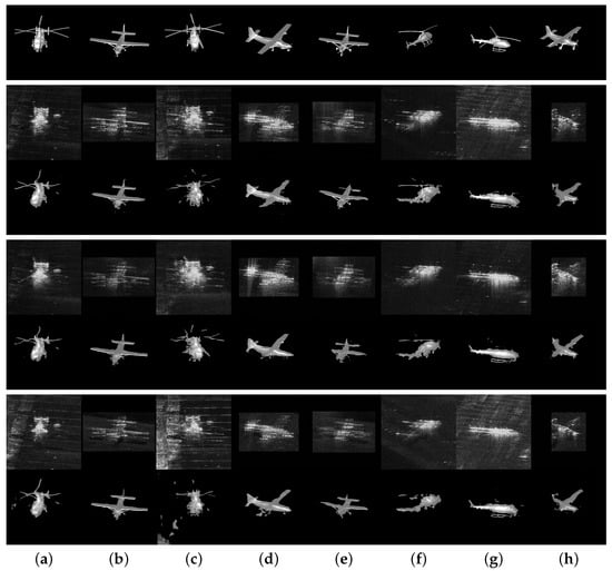 Examples of the SAR-to-optical translation results are shown in Figure 5: First of all, through local image reconstruction, separated speckles are translated into continuous areas and the background is effectively purified in translated images, which significantly improves the image quality and makes them more friendly to human eyes. Some clutter caused by the SAR imaging process, such as bright stripes in the background of HH SAR images in (f) and (g), are effectively judged as noise and eliminated. Secondly, not only are the main bodies of the aircraft targets, like fuselages, wings, and tail fins (including the horizontal stabilizer fin and the vertical fin), successfully restored to their optical counterpart, but the missing and distorted prior details of the aircraft structure like undercarriages are also recovered. Successful reconstruction of the aircraft structure can better enhance the recognition of aircraft types and orientations. For example, in (I), the structure and the orientation of the KA-32 in SAR images have become difficult to recognized due to defocus, while the same recognition problem in translated images is very easy referring to the features. These positive results verify the effectiveness of the SAR-to-optical translation network of targets.