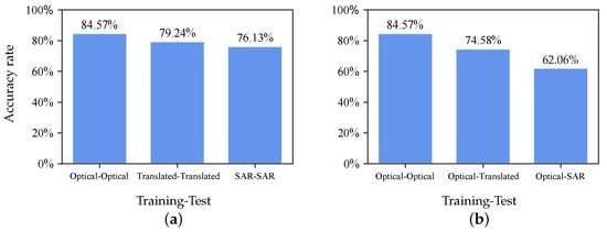 Results of recognition. The ordinates indicate the recognition accuracy. In the horizontal coordinate, the former is the type of training data, and the latter is the type of test data. (a) represents the results of training and testing using the same kind of data. (b) represents the results of training with optical images, testing with optical images, translated images, and SAR images.