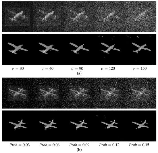 Gaussian noise and salt-and-pepper noise are two kinds of common noise in imaging processing [45]. Gaussian noise is usually caused by poor working conditions of imaging sensors and inadequate light sources, whose intensity can be described by the standard deviation of the Gaussian distribution. Salt-and-pepper noise, as a kind of pulse noise, randomly changes some pixel values of images, which is the black and white bright spot noise generated in transmission channels, decoding processing, and so on. The intensity of salt-and-pepper noise is determined by the change probability of pixels.