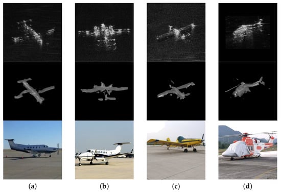 A new dataset SPH4 is created for this research, which includes pairs of multi-view SAR-optical images of aircraft targets. Two types of small fixed-wing planes (Quest Kodiak 100 Series II and Cessna 208B) and two types of helicopters (Ka-32 and AS350) are selected as targets because of their typical characteristics of fixed-wing aircraft and helicopters. These characteristics can endow the feature extraction network with the ability to adapt to other types of aircraft. The SAR images have a resolution of 0.3 m × 0.3 m, including HH, HV, and VV polarized modes, derived from a Ku-band UAV SAR with a center frequency of 14.6 GHz, a bandwidth of 600 MHz, and a flight altitude of 150 m. Due to the range-based image mechanism and the low-altitude of UAV SAR, targets in the original SAR images are inverted with foreshortening effects, which is not consistent with the perspective of human visual habits. Therefore, the original SAR images are flipped upside down, which means the upper end of the image is proximal and the lower end is distal. Aircraft targets in the original SAR data are sliced, classified, and labeled to annotated 8-bit grayscales with a size of 256 × 256 pixels. Corresponding optical images of the same size are generated by exploiting the ray-tracing algorithm referring to the active infrared imaging. Images of each aircraft type under each viewpoint are grouped into a category that covers three SAR images in HH, HV, and VV, respectively, and one optical image. With SAR images in different polarization modes sharing one optical image in one category, the SPH4 contains 107 categories, a total of 321 pairs of SAR-optical images. As with the examples of SPH4 and photos of the targets shown in Figure 4, there is high consistency between the corresponding real target, the SAR image, and the simulated optical image.