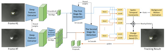 Inspired by SiamRCNN, SiamSTA is built based on a three-stage re-detection mechanism that first retains template information in the initial frame, then integrates predictive information from historical frames, and finally lifts discriminative capability to perceive tiny objects with a change detection based CF, as shown in Figure 1. To deal with background distractors, several practical guidelines using spatio-temporal attention are introduced to regulate candidate proposals. SiamSTA further incorporates a collaborative strategy that combines local search and global detection to facilitate online tracking.