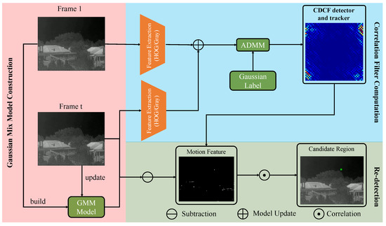 Based on the accurate motion estimation of background, change detection based correlation filter (CDCF) tracker is further proposed to take advantage of target’s motion features. CDCF is coupled with SiamRCNN’s two-stage re-detection to form a three-stage re-detection framework. The pipeline of CDCF module is shown in Figure 2. The red area on the left side indicates the Gaussian Mixture Model (GMM) construction process, which is used to describe the background and updated every frame. The blue area shows the computation process of correlation filter, and the green area depicts the combination of motion features and the correlation filter tracker to finally obtain a credible target state output.