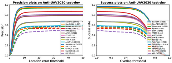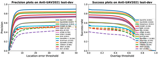 Figure 5. Precision and success plots of our SiamSTA and state-of-the-art trackers on the Anti-UAV2021 test-dev dataset. The mean precision and AUC scores are reported for each tracker. Best viewed in color and zoom.