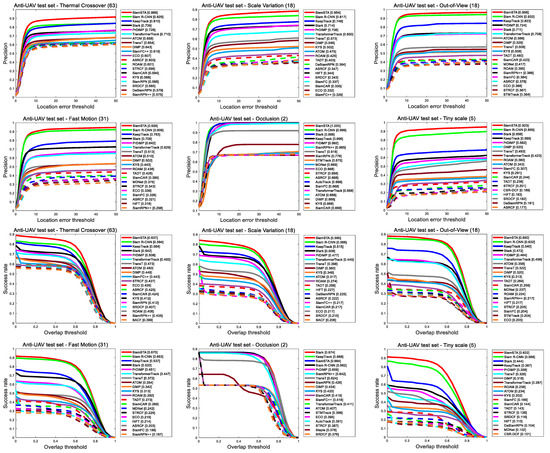 Figure 7. Precision and success plots of our SiamSTA and state-of-the-art trackers on the different attributes defined in Anti-UAV [16] test set. The mean precision and AUC scores are reported for each tracker. Best viewed in color and zoom.
