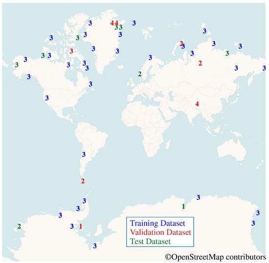 The sensing period for the images used in our study was between October 2019 and December 2020. We used 96 scenes in the training dataset, 22 scenes in the validation dataset and 23 scenes in the test dataset. The sites of these scenes were randomly selected in the polar and tundra regions. We also included three sites in mountainous terrain that were not in the polar and tundra region. The geographic distribution of the data is shown in Figure 1. The tile-wise quarterly distribution of the Sentinel-2 scenes for the training, validation and test datasets is provided in Table A1, Table A2 and Table A3, respectively.