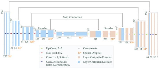 At each encoder and decoder block, there are two sequences, comprising a convolution layer, a ReLU layer, and a batch-normalization layer connected in series, followed by a spatial dropout. The convolution layers used here had a kernel size of and a stride of 1.