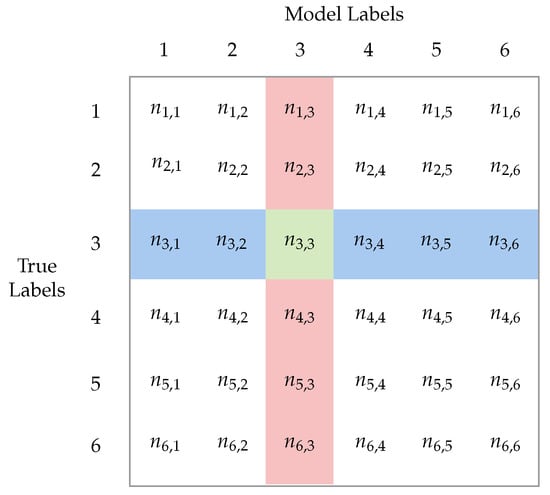 The performance metrics used for the model evaluation were computed from a pixel-level confusion matrix: Consider the confusion matrix for an M-class segmentation problem shown in Figure 3. Each element in the matrix, denoted by , is the total number of pixels that belong to class i and predicted as class j by the model. For class i,