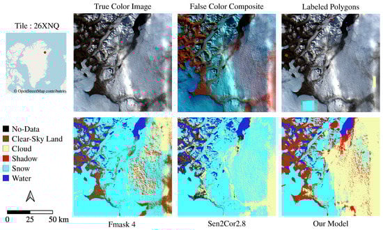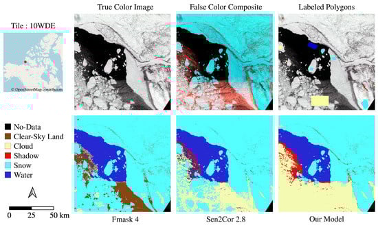 We also compared our model performance against the results from Sen2Cor 2.8. The Sen2cor algorithm is part of the European Space Agency’s (ESA) processing pipeline, used for generating the L2A images []. This algorithm produces a scene classification (SCL) image, in addition to various quality indicators and bottom-of-atmosphere (BOA) images. The resolution of the SCL was set to 20 m and no additional digital elevation model (DEM) was provided. While the Fmask segmented the image into the same six classes that we used for training our model, Sen2Cor provided a more comprehensive class organization. For example, the Sen2Cor scene classification mask has four classes for clouds: cloud high probability, cloud medium probability, cloud low probability and thin cirrus clouds. To perform the comparison, we combined multiple classes from the Sen2Cor mask into the six classes used in our model, as shown in Table 2.