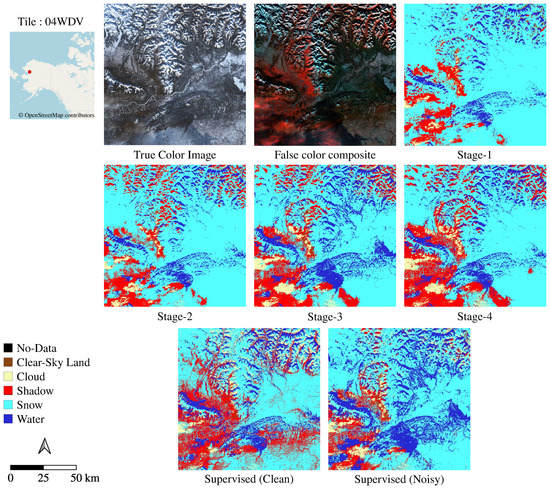 Comparison of test image results from different stages of the self-training framework and the results from the models trained using supervised training, from Tile 04WDV in Alaska, USA, captured on 27 October 2020.