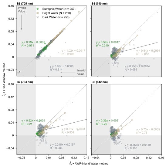 - Pahlevan, N.; John, R.S.; Franz, B.A.; Zibordi, G.; Markham, B.; Bailey, S.; Schaaf, C.B.; Ondrusek, M.; Greb, S.; Strait, C.M. Landsat 8 remote sensing reflectance (Rrs) products: Evaluations, intercomparisons, and enhancements. Remote Sens. Environ. 2017, 190, 289–301. [Google Scholar] [CrossRef]