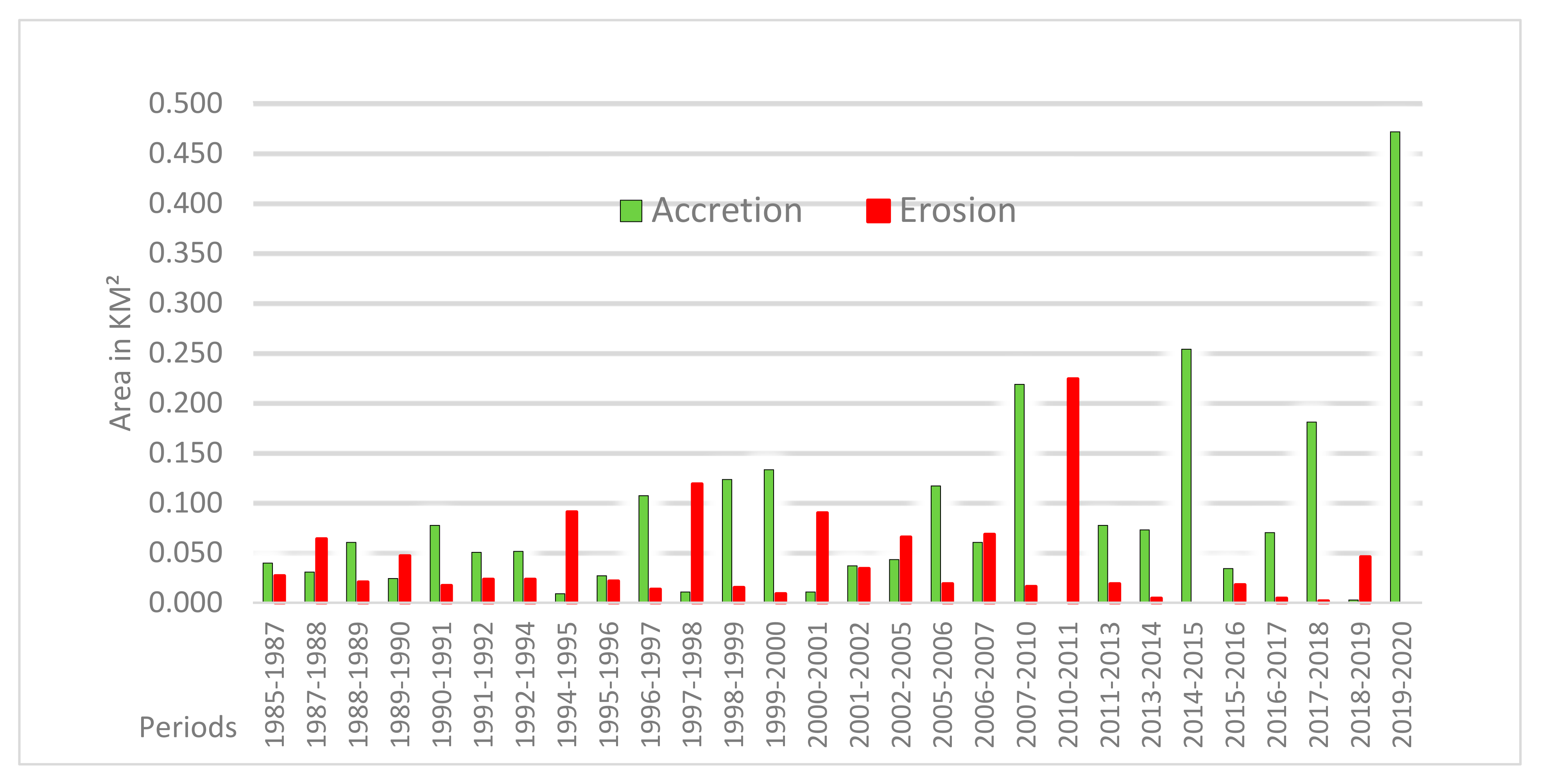 - Saleem, A.; Dewan, A.; Rahman, M.M.; Nawfee, S.M.; Karim, R.; Lu, X.X. Spatial and temporal variations of erosion and accretion: A case of a large Tropical River. Earth Syst. Environ. 2020, 4, 167–181. [Google Scholar] [CrossRef]