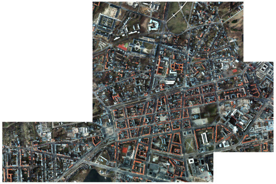 (2) INRIA dataset: The INRIA dataset [32] comprises images captured by airborne sensors and consists of 360 tiles of aerial images. Each aerial image (Figure 4) has pixels at a GSD of 30 cm/pixel. In this dataset, only the ground reference data of five regions (Austin, Chicago, Kitsap County, Western Tyrol, and Vienna) are made publicly available, and hence we only conducted experiments on these regions. According to the set up in [16], the data were split into training and validation sets in our research. The training set had 155 images, and 31 images with ids 6-36 were collected from each region, respectively. The validation set had 25 images, and 5 images with ids 1-5 were collected from each region, respectively. The statistics were derived from the validation set.