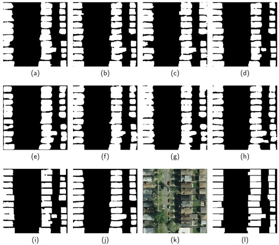 The results obtained by the different methods (Figure 6) correspond to the example area selected on the INRIA dataset. This scene belongs to a residential region where nearly connected buildings are detected as large buildings by most naive semantic segmentation networks (e.g., FCN-8s [11], HRNet [14], and HA U-Net [34]). It is notable that in Figure 6j, RegGAN is able to effectively distinguish consecutive buildings. Moreover, building boundaries delineated by the proposed approach are more rectilinear and precise when compared to other methods. This suggests that RegGAN is still promising in such challenging situations.
