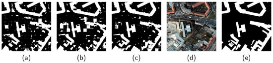 Results obtained from (a) RegGAN (no regularized loss), (b) RegGAN (no multiscale discriminator), and (c) RegGAN. (d,e) are the corresponding remote sensing image and ground reference on the ISPRS dataset (GSD: 5 cm/pixel).
