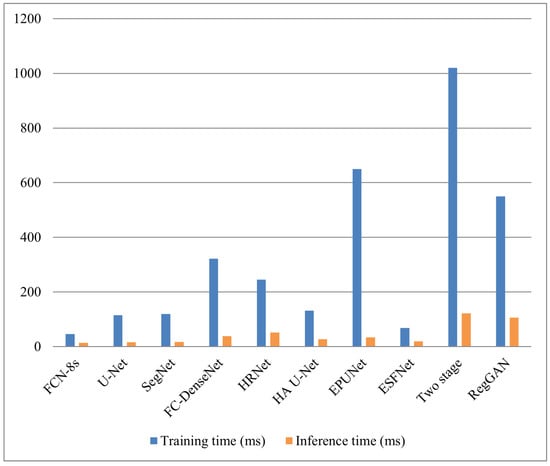 Apart from the accuracy of the generated building footprint maps, the time efficiency of different methods is also of great interest in practical applications. In this regard, we investigated the training and inference time of the different methods (Figure 9). Specifically, the training time refers to the time cost of one iteration (batch size was 4), while the inference time measures the time cost of a single batch.