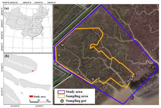The location of the research area and sampling sites. (a) The site on Chongming Island, Shanghai, in China. (b) The study area of Dongtan on Chongming Island. (c) The sampling area on Dongtan.