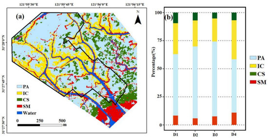 Figure 2a shows the most abundant species in vegetation communities. Spatially, IC and SM were continuous distribution and appeared aggregated distribution along tidal creeks, and PA was mainly distributed within the inland domain of the research area, and CS was scattered or mixed with PA in the research area (Figure 2a). As distances from tidal creeks increased, the percentage of PA gradually increased, while other plant communities showed a downward trend (Figure 2b). Within the distance of D1 from the creeks, PA was present in the largest proportion (54.73%), followed by IC (27.68%) and CS (9.33%), while SM was present in the lowest proportion (8.26%). The largest proportion in D2 is PA (63.96%), followed by IC (23.25%), CS (6.92%), and SM (5.87%). Within the distance of D3, the proportion of PA (66.70%) was highest, compared with IC (20.58%), SM (7.62%), and CS with the lowest proportion (5.10%). The percentage of PA was the highest (47.71%) around D4 compared with the other communities—34.63%, 10.84% and 6.82% for IC, SM, and CS, respectively.