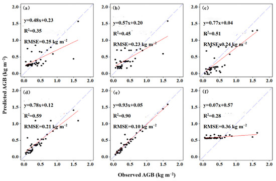 The relationship between measured and predicted AGB of coastal salt marsh vegetation. (a) MLR; (b) KRLS; (c) ANN; (d) GBM; (e) RFR; (f) GLM. The red full line indicates a linear fit, and the blue line of dashes indicates a 1:1 line.
