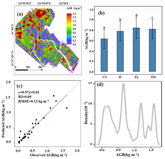 The spatial distribution, validation, and comparisons of AGB for different salt marsh communities. (a) Mapping the AGB of salt marsh vegetation using UAV-LiDAR data and a random forest model. (b) The mean AGB for different salt marsh communities. (c) Regression fitting between AGB in the field survey and AGB predicted based on UAV-LiDAR data and a random forest model. The red full line indicates a linear fit, and the blue line of dashes indicates a 1:1 line. PA: Phragmites australis; CS: Carex scabrifolia; IC: Imperata cylindrica; SM: Scirpus mariqueter. (d) Density distribution curve of the predicted AGB. The data with different lowercase letters show a significant difference.