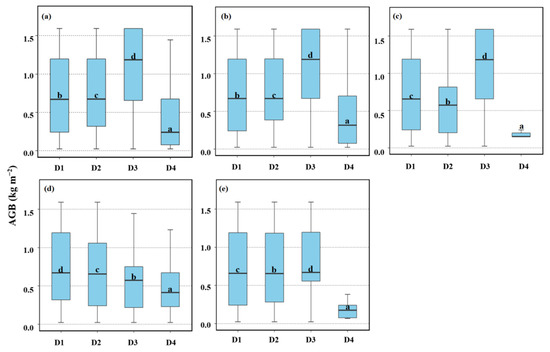 Comparisons of salt marsh AGB of different distances from tidal creeks. (a) represents the AGB change trend of the whole vegetation community; (b–e) represent the AGB change trend of PA, IC, CS, and SM, respectively. The data with different lowercase letters show a significant difference. D1: 0–50 m; D2: 50–100 m; D3: 100–150 m; D4: 150–200 m.