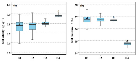 Comparisons of soil salinity and moisture at different distances from tidal creeks. (a) Comparisons of soil salinity at different distances from tidal creeks. (b) Comparisons of soil moisture at different distances from tidal creeks. The data with different lower-case letters show a significant difference. D1: 0–50 m; D2: 50–100 m; D3: 100–150 m; D4: 150–200 m.