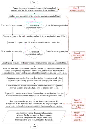 Stage 4—scatter digital terrain generation: using the generalized cross-sectional data and the weighted distance method, the elevation interpolations of all grid nodes are conducted along longitudinal grid lines to generate the whole riverway digital terrain. The detailed digital terrain reconstruction process can be seen in following contents.