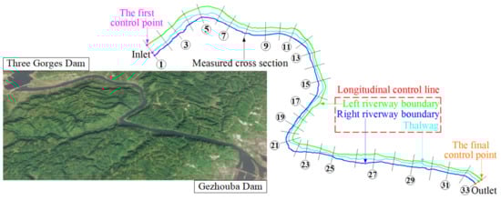 The longitudinal control line data are actually a series of sequential plane control points, which can determine the plane shapes of the longitudinal control lines and can be obtained by interpreting satellite images, remote sensing images or site surveys [24,25,26,27,28,29]. As shown in Figure 2, for any a longitudinal control line, the first control point and the final control point are the intersections of the inlet measured cross section, the outlet measured cross section and the longitudinal control line. If the effects of river control works, production dikes and other engineering boundaries need to be considered, the positional coordinates of the engineering boundaries should be provided. In addition, It should be pointed out that this method does not require the acquisition of too many longitudinal control lines, but generally speaking, the more the number of the used longitudinal control lines is, the more accurate the calculated result is.