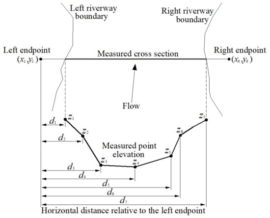 The measured cross-sectional terrain data mainly include the cross-sectional left and right endpoint coordinates (the left and right sides are defined according to the flow direction), the measured point elevations and the horizontal distances between the measured points and the corresponding left endpoint (in Figure 3).