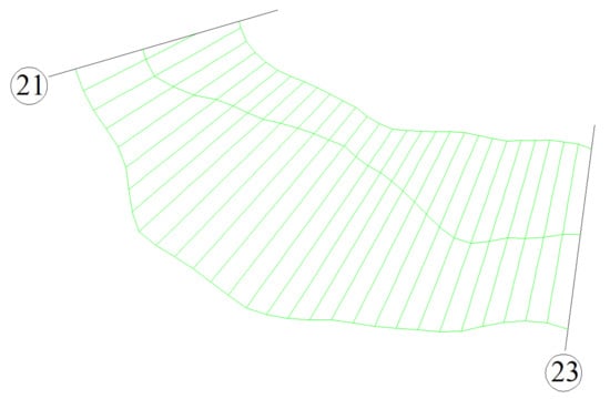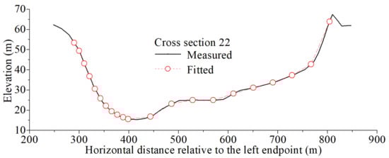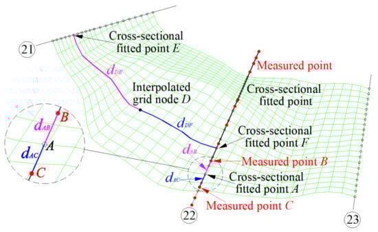After the grid generation in the target river reach is completed, the intersection coordinates of each measured cross section and the longitudinal grid lines could be calculated and translated into the horizontal distances relative to the measured cross-sectional left endpoint. Then, the measured cross-sectional data are used to interpolate the intersections of the measured cross sections and the longitudinal grid lines by the weighted distance method to reasonably fit the measured cross sections (Figure 6 only shows the 22nd cross section). The weighted distance method is an interpolation method based on the similarity principle, and it constructs the interpolation weights by the distances between the interpolated point and the sampled points. The shorter the distance between the interpolated point and a sampled point is, the greater the weight granted by the sampled point. In this step, the specific interpolation process is as follows: As shown in Figure 5, for a cross-sectional fitted point A and two measured points B and C, which are located in the same cross section as that of point A and are closest to point A, if the elevations of points B and C are and , and the distances between A and points B and C are, respectively, and , then the elevation of point A can be calculated according to Formula (3).