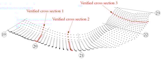 To verify the reasonableness of the calculated results, authors conducted a supplementary measurement for the actual terrains of the three verified cross sections (in Figure 7). Through a comparison of the calculated results with the measured results of the three verified cross sections, it can be found that the calculated results are be close to the measured results in cross-sectional shape, and the relative errors () of the calculated cross-sectional areas and the calculated wetted perimeters may reach more than 40% at a low water level, but smaller than 5% at a moderate water level (in Figure 8). In river simulation, if the relative error between the constructed riverway model and the actual terrain is not more than 5%, we usually believe that the constructed river model meets the calculational accuracy requirements [23,30]. This means that at a moderate water level, the method presented in this paper is accurate enough to meet the terrain accuracy requirements in actual production. For the exemplified riverway, why the relative errors of the calculated results are large at a low water level is due to the small number of the used longitudinal control lines and the large grid spaces. In this paper, three longitudinal control lines and large spaces are used for the riverway grid generation only to clarify the specific principle of the digital terrain reconstruction method in a concise way. In practical applications, if conditions permit, we should try our best to increase the numbers of the longitudinal control lines and the measured cross sections and choose small grid spaces as far as possible, which can further improve the calculational accuracy.