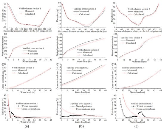 Comparisons between the measured and calculated results related to cross-sectional shape, wetted perimeter and cross-sectional area ((a) corresponding to the verified cross section 1; (b) corresponding to the verified cross section 2; (c) corresponding to the verified cross section 3).