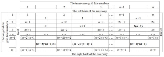 Coding rules of nodes and cells in the MIKE21 quadrilateral grid file (The rows marked “1, 2, …, m” represent longitudinal grid lines; the columns marked “1, 2, …, n” represent longitudinal grid lines; the bold values in the figure are the cell numbers; and the values at the four corners of the bold values are the node numbers.).