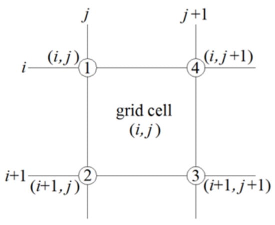 Numbering calculation of nodes constituting a MIKE21 quadrilateral grid cell (“i” and “i + 1” represent the serial numbers of the adjacent longitudinal grid lines; “j” and “j + 1” represent the serial numbers of the adjacent transverse grid lines; the cell serial number is marked by the combination (i, j); and “➀~➃” are the node numbers constituting the cell).