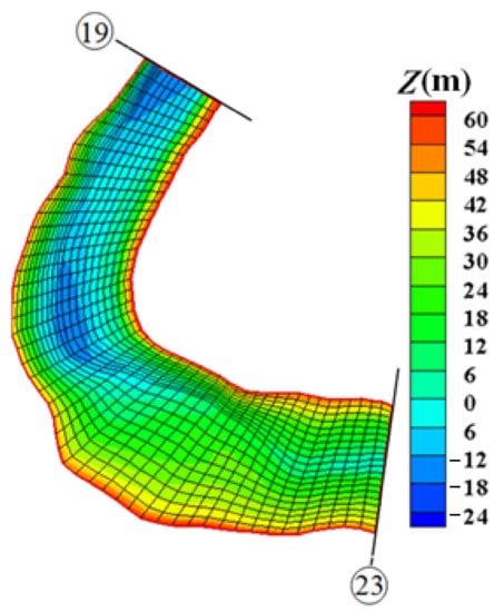 Using the above rules, after the readable grid file is generated by computer programming, it can be imported into the two-dimensional flow and sediment transport module of SMS to conduct the numerical simulation. After the grid file is imported into the stated module, the three-dimensional riverway grid can be obtained as shown in Figure 14.