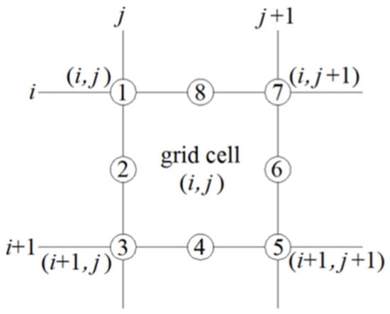 Numbering calculation of nodes constituting an SMS quadrilateral grid cell (“i” and “i + 1” represent the serial numbers of the adjacent longitudinal grid lines; “j” and “j + 1” represent the serial numbers of the adjacent transverse grid lines; the cell serial number is marked by the combination (i, j); and “➀~➇” are the node numbers constituting the cell).