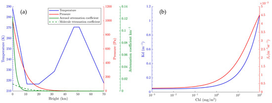The temperature and pressure profiles used in the model and aerosol and molecular attenuation coefficient with the wavelength of 532 nm (a); Kd and versus chlorophyll concentration with the wavelength of 532 nm (b).