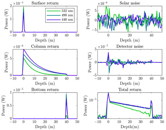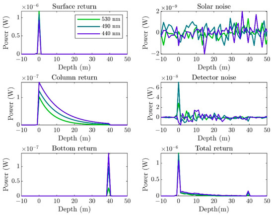 Simulated waveforms of each part (sea surface return, sea column return, sea bottom return, solar background noise, detector shot noise, and total return signal, respectively) in clear water with chlorophyll concentration of 0.1 mg/m3, and laser wavelength of 530 nm, 490 nm, and 440 nm with a 40-m sea bottom depth.