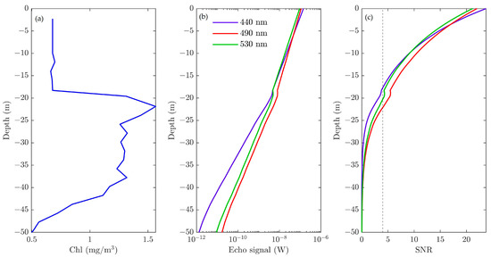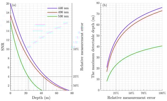 Figure 4 shows the SNR and the maximum detectable depths versus several different relative measurement errors. In the case of a water condition with a chlorophyll concentration of 0.1 , the wavelengths of 440 and 490 nm have close detectable depths, and they could penetrate 20 m more than 530 nm when the SNR is 4, as shown in Figure 4a, which indicates that the wavelength is vital for the lidar system. If we broaden the threshold, the differences between the three wavelengths will increase. When the relative measurement is 100%, their difference reaches 40 m.