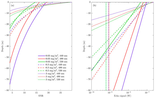 Figure 5 shows the results with different types of water. In clean water where chlorophyll concentration is 0.03 mg/m3, the lidar can penetrate more than 100 m and the corresponding optimum wavelength is 440 nm. Moreover, the detectable depth varies greatly between different wavelengths. As shown in Figure 5, the wavelength of 440 nm could reach 50 m more than 530 nm for clean water. However, in areas with higher chlorophyll concentrations, such as coastal water, and the chlorophyll concentration is about 0.3 mg/m3, the detectable depths are much smaller, and the corresponding optimum wavelength turns into 490 nm. As the chlorophyll concentration continues to increase, the corresponding optimum wavelength moves into green bands, and the wavelength of 530 nm has the maximum depth in this condition. This result shows an apparent fact that different types of water correspond to different optimum wavelengths, and the results between wavelengths have large differences. Figure 5b shows the echo signals and their corresponding solar background. Compared with Figure 5a, the depth where the echo signal equals the solar background is a little deeper than the maximum detectable depth indicated by the SNR in Figure 5a. This is largely because the SNR takes into account not only the solar background but also the detector noise. The results show that a proper wavelength can greatly improve the detection capability of the lidar system.