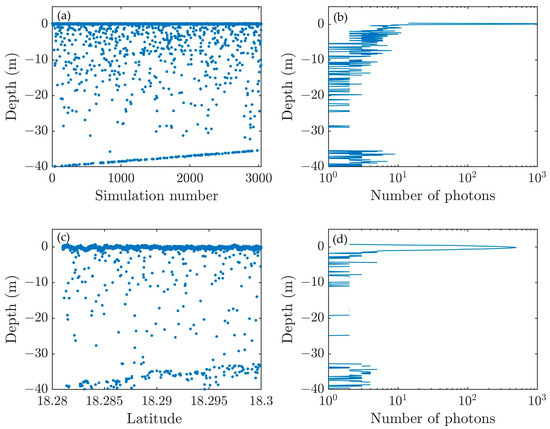Then we compared the simulated results with ICESat-2 parameters [48,49]. Table 2 and the measured result in ATL03 dataset ATL03_20181122060325_08340107_004_01 located at St. Thomas Island. The dataset from 18.281°N to 18.3°N, where the seafloor is relatively flat, was extracted for verification. The region spans 2125.3 m and the number of corresponding laser shots is 3037, considering the pulse repetition frequency of ICESat-2. As shown in Figure 6, the detected photon events have similar distributions and the number of integrated photons at the sea surface and the seafloor are close. The results have verified the effectiveness of SOLS.