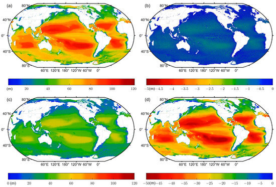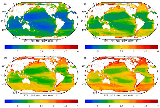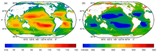 As for the maximum detectable depth, the lidar can always reach above 100 m in the oligotrophic sea at both sides of the equator, as denoted by the red colors in Figure 21a, Figure 22a, Figure 23a and Figure 24a, although the maximum detectable depth decreases by about 10 m in the summer, as shown in Figure 22a. The maximum depth in coastal areas and high latitudes have more complex and varying patterns. The results show that the maximum depth continuously becomes shallower in coastal areas and mid-to-high latitudes, which are denoted in green in Figure 21a, Figure 22a, Figure 23a and Figure 24a. This phenomenon may be caused by chlorophyll concentration seasonal variability.