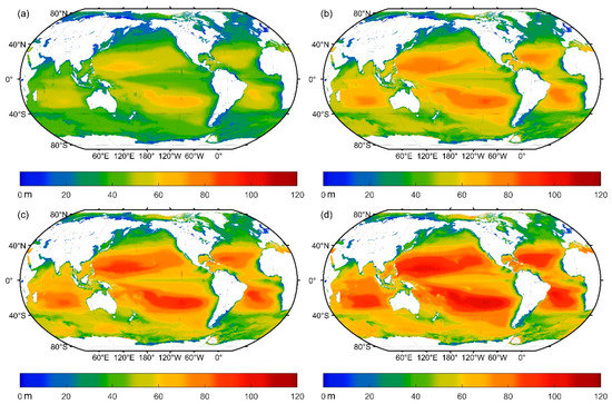 Overall, the results show that the lidar system can penetrate the upper mixed layer in most of the global oceans in different seasons (about 70% in spring, autumn, and winter, and about 60% in the summer, as mentioned above). It is only in high-latitude areas with strong vertical mixing where the upper mixed layer cannot be penetrated, especially in the summer (Figure 22). The maximum detectable depths in oligotrophic seas on both sides of the equator are stable and even reach 120 m. On the contrary, coastal and high-altitude areas have varying maximum detectable depths, which may be caused by chlorophyll concentration seasonal variability. It indicates that future spaceborne oceanic lidar will be an effective detection tool for understanding vertical structure information of the upper-ocean mixed layer.