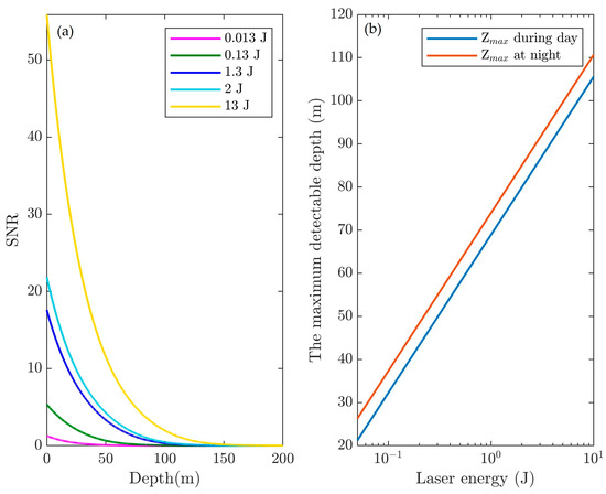 Depth penetration for the lidar could achieve with (a) a dynamic range and (b) a dynamic range with 490 nm, considering the strong backscattering of the sea surface.