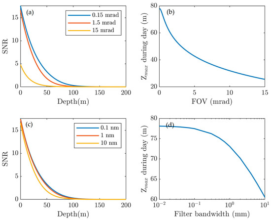 We analyzed the SNR during daytime for spaceborne lidar with various FOV and filter bandwidths. FOV from 0.15 to 15 mrad for a specific 0.1-nm filter bandwidth and a filter bandwidth from 0.01 to 10 nm for a specific FOV of 0.15 were tested, respectively. The results are shown in Figure 18. It appears that decreasing FOV and the filter bandwidth improves the SNR during the daytime because small FOV and filter bandwidth suppress the background light. With the least access of background light, the result indicates that the detectable depth reaches its maximum value with a 0.15-mrad FOV and a 0.1-nm filter bandwidth. Therefore, an oceanography lidar will perform better if FOV and the filter bandwidth are as small as possible. However, the result shows that FOV and the filter bandwidth have different importance in improving SNR in the daytime. To reach the same detectable depth, FOV needs fewer changes. In other words, decreasing FOV is more efficient than narrowing the filter bandwidth, as shown in Figure 18b,d.