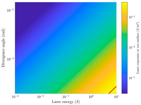 Laser exposure at the sea surface versus the laser energy and divergence angle. The redline is the single-pulse exposure limit.