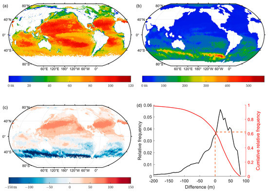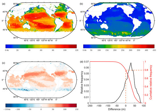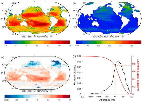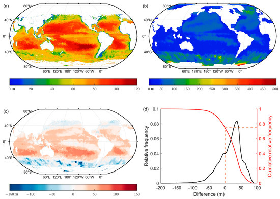 Comparison between lidar maximum detectable depth and MLD in the autumn (the northern hemisphere). Distribution of the lidar maximum detectable depth at daytime (a), mixed layer depth (b), the difference between lidar maximum detectable depth and mixed layer depth (c), and the relative frequency distribution of the difference (d).